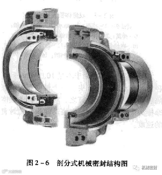 图2一6所示为一种剖分式机械密封。从图中可看到,压盖、动环、动环座、静环及辅助密封圈均设计成有接缝的对开环和开口密封圈。开口密封环两端做成球窝对接。该类型密封装置安装方便、速度快、停机时间短;不用拆卸泵或联轴器,就可以快速拆装。目前为止,该密封技术还不够成熟,存在密封环能否长期、重复使用和保证密封的问题。