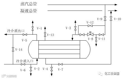5)引蒸汽时要缓慢,升温速度控制在25℃/h,做到先预热后加热,先打开调节阀(V-8)倒淋(V-11),再缓慢开启蒸汽根部入口阀(V-9)暖管,至倒淋无水时,关倒淋,打开壳体高点放空阀(V-13),先由副线阀(V-12)控制升温速度,由壳体高点放空阀(V-13)排气,排气完毕后关闭;打开底部倒淋(V-4)排凝,至凝液温度、压力满足要求时,关闭底部倒淋,打开(V-7)和(V-10)至凝液总管。稳定后缓慢提量,再由副线阀切换到控制阀;