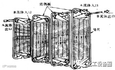 板式换热器是由一组长方形的薄金属板平行排列,夹紧组装于支架上面构成。两相邻板片的边缘衬有垫片,压紧后板间形成密封的流体通道,且可用垫片的厚度调节通道的大小。每块板的四个角上,各开一个圆孔,其中有两个圆孔和板面上的流道相通,另两个圆孔则不相通。它们的位置在相邻板上是错开的,以分别形成两流体的通道。冷、热流体交替地在板片两侧流动,通过金属板片进行换热。板式换热器便于清洗,操作压力和温度受密封垫片材料性能限制而不宜过高。