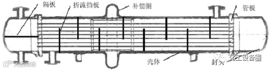由于冷热流体的温度不同,外壳和管子的温度也必然会有所差异,会导致外壳和管子热膨胀的程度有所不同,严重时可将管子扭曲变形,或管子从管束上脱落。当外壳和管子的温差超过50℃时,就必须采取措施来减小或消除它们之间因热膨胀量不同所造成的影响,固定管板式换热器采用补偿圈来消除管子与壳体的热膨胀量不同引起的热应力的影响。它与普通固定管板式换热器的不同,就在于在壳体上具有一圈通过滚压或焊接的波形补偿圈(又称膨胀节),这种换热器结构简单,但补偿能力有限,它只能在管子与壳体的温度差不大于60~70℃的情况下使用。另外,当壳程流体压强大于6atm时,由于补偿圈过厚,难以伸缩,也会失去温差补偿的作用。