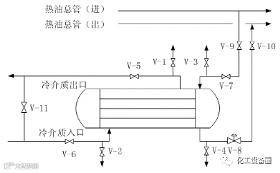 4)引热油时要缓慢,升温速度控制在30℃/h,做到先预热后加热,防止换热器法兰突然受热漏油,先由热油根部出口阀(V-10)控制升温速度,打开高点放空阀(V-3),全开热油出口控制阀(V-8),由高点放空阀(V-3)排气,排气完毕后关闭;再打开热油入口阀(V-7)和热油根部入口阀(V-9),稳定后缓慢提量,再由根部阀切换到控制阀;