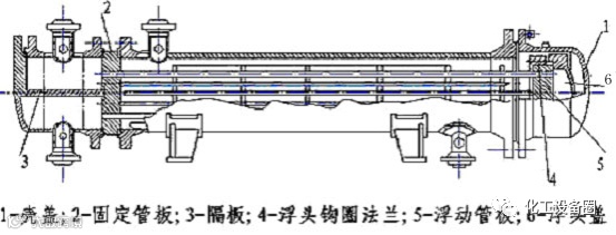 其结构特点是将管侧一端的管板用法兰固定到壳体上,另一端管板可以在壳体内沿轴向自由伸缩,该端称为浮头。浮头式换热器的优点是当换热管与壳体有温差存在,壳体或换热管膨胀时,互不约束,不会产生温差应力;管束可从壳体内抽出,便于管内和管间的清洗。其缺点是结构较复杂,用材量大,造价高;浮头盖与浮动管板之间若密封不严,发生内漏,会造成两种介质的混合。浮头式换热器适用于壳体和管束壁温差较大或壳程介质易结垢的场合。