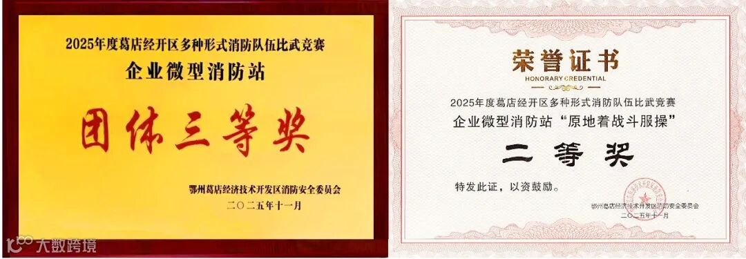 2025年11月,鄂州园区在葛店经开区多种形式消防队伍比武竞赛中,获得企业微型消防站团体三等奖、原地着战斗服操二等奖。