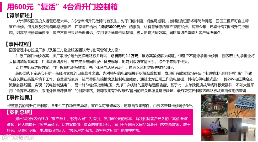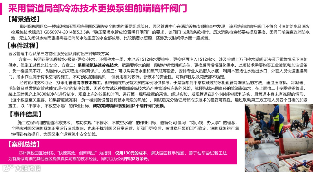 唯品会物流发展公司内部每月进行优秀案例评选,其中热成像仪主动排查各种隐蔽的电气安全隐患、消防管道维修局部冷冻技术、低成本修复提升门控制箱等微创新成果,获得公司内部奖励并推行全国园区,为公司降本增效起到了示范作用。