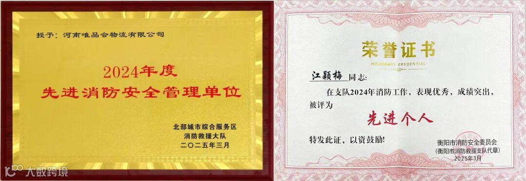 2025年3月,郑州保税园区获得属地消防救援大队颁发2024年度先进消防安全管理单位称号,衡阳园区负责人获得衡阳市消防安全委员会颁发2024年消防工作先进个人荣誉。