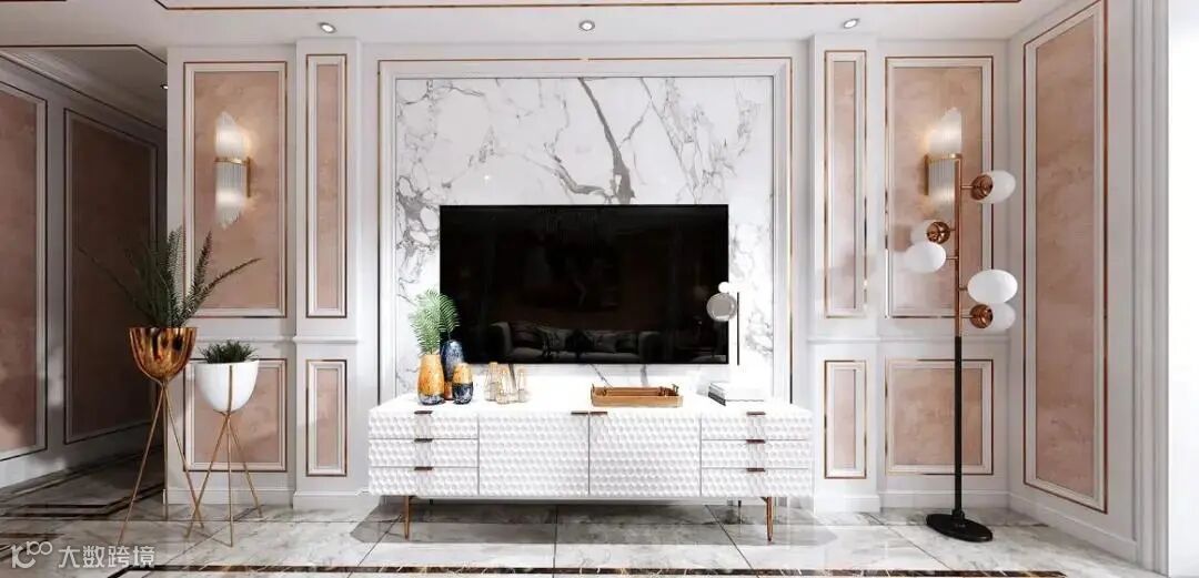 现代轻奢感是Salenma萨拉玛原装进口艺术涂料背景墙的拿手好戏。晕染的橘红色让墙体更生动,电视背景墙部分则用仿理石纹的形式单独表现,与地面呼应,相辅相成,整体流露出精致的奢华感十分高级。