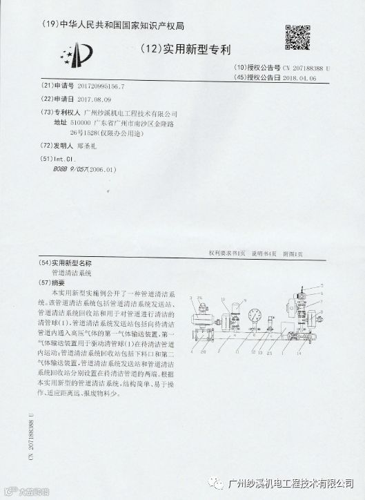 在全体员工的持续努力和用户的信任下;公司于2018年4月6日取得国家知识产权局颁发的管道清洁系统实用新型专利证书。