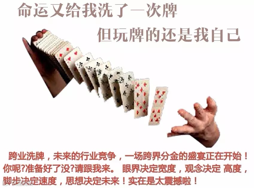 跨业洗牌,未来的行业竞争,一场跨界分金的盛宴正在开始!你呢?准备好了没?请跟我来。。。。 眼界决定宽度,观念决定高度,脚步决定速度,思想决定未来!