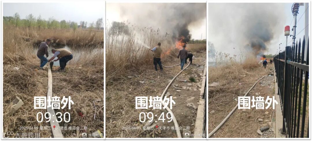 2025年4月9日上午9点21分左右,唯品会天津园区二期园区外东侧公共绿地的枯草突然起火。园区管理中心监控室值班人员通过监控画面第一时间发现火情,迅速汇报并立即拨打 119 报警,同时启动火灾应急预案。
