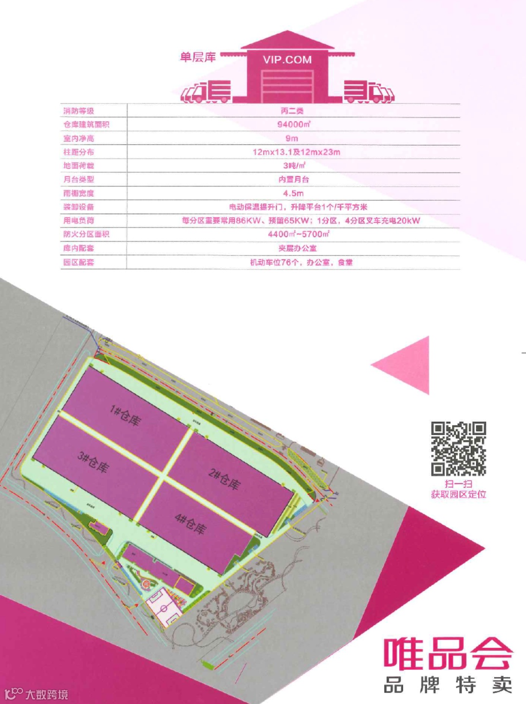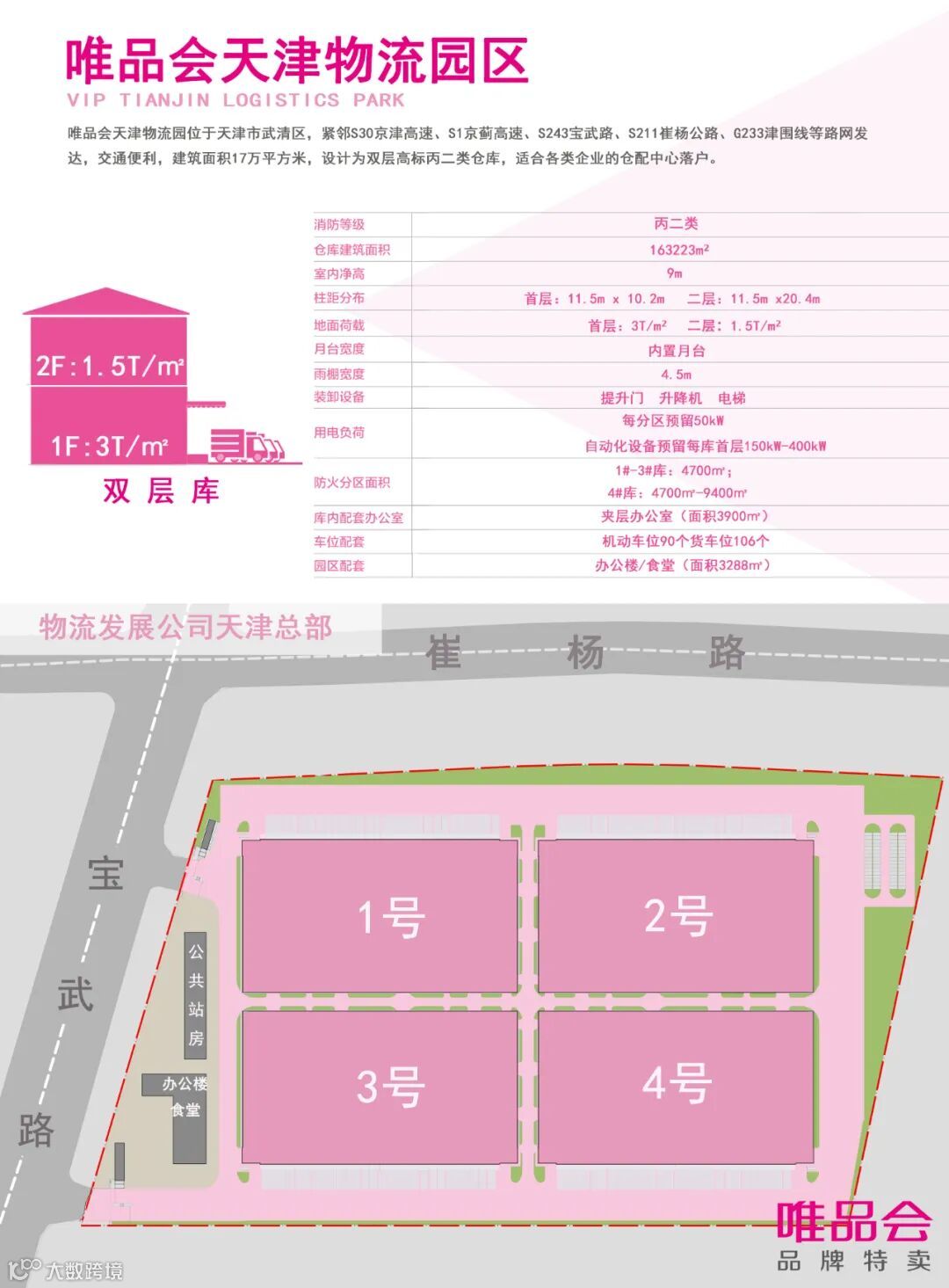 天津唯品会物流园区分为一期二期,一期建筑面积9万平方米,设计为4栋单层单边装卸的高标丙二类仓库,1栋办公及食堂,二期建筑面积17方平方米,设计为4栋双层高标丙二类仓库、1栋食堂,一二期均有唯品会华北RDC进驻,园区快递生态链成熟,与当地政府关系良好,园区两路高压供电,自动化设备预留每库首层150kw-400kw,欢迎各类企业的仓配中心落户共享资源。