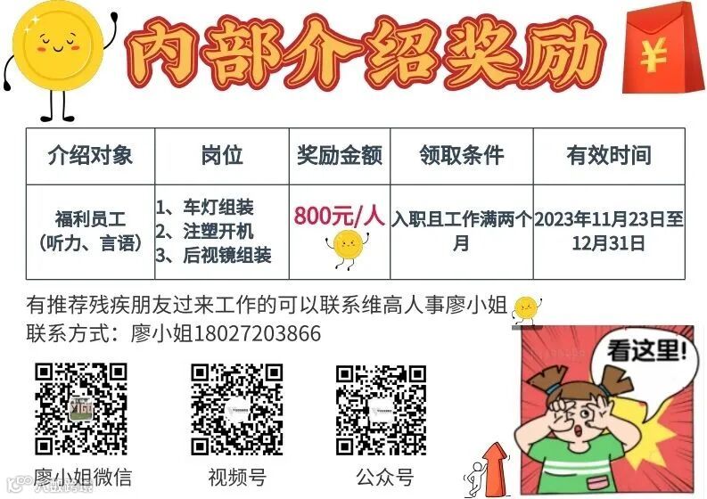 维高的员工介绍残疾人来维高工作有800元的介绍奖励!!!