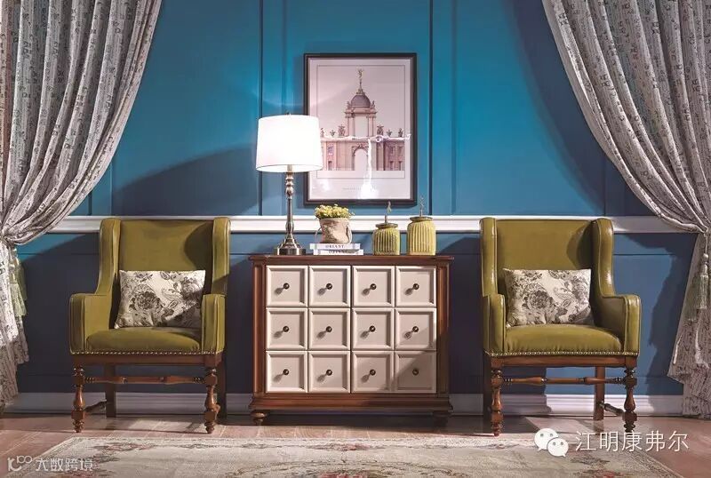 相比美式家具传统的黑、白胡桃木,橡木的单一色调,现代美式家具色调越趋丰富多彩,激情奔放的大红、冷酷沉静的灰蓝、生机盎然的果绿......多样化的色彩或大范围或局部使用,既有丰富的色彩魅力,又有低调奢华的视觉效果,突破了传统美式家具的氛围。