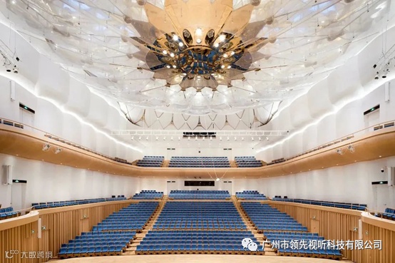 大音乐厅 呈“鞋盒型”,厅内有以成都市花芙蓉元素设计的天花穹顶,辅以水晶之感的材料,暖色灯源开启后,璀璨晶莹,呈现“冰芙蓉”的视觉效果。天花穹顶不仅美观,还能通过升降高度达到调节音质的作用,根据不同演出需要调节室内层高,为观众呈现最佳的视听效果。