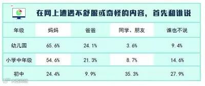 在“网上遇到不良内容,你会和父母说吗?”数据显示,随着年纪的增长,看到不良信息后,孩子对父母说的比例一直下降,和同学朋友说的比例快速上升,“谁也不说”的比例在提升。