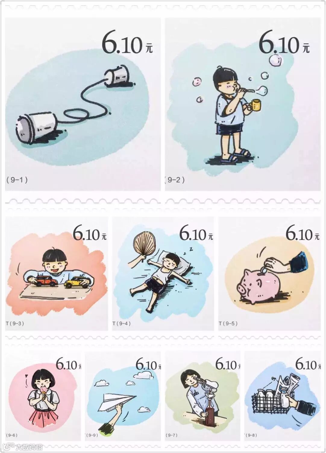 吹泡泡、纸飞机、大蒲扇、纸听筒……6月1日微信朋友圈联合九大品牌,首次以集邮形式开展品牌广告推广,大有让人一夜之间穿越回到童年的恍惚。