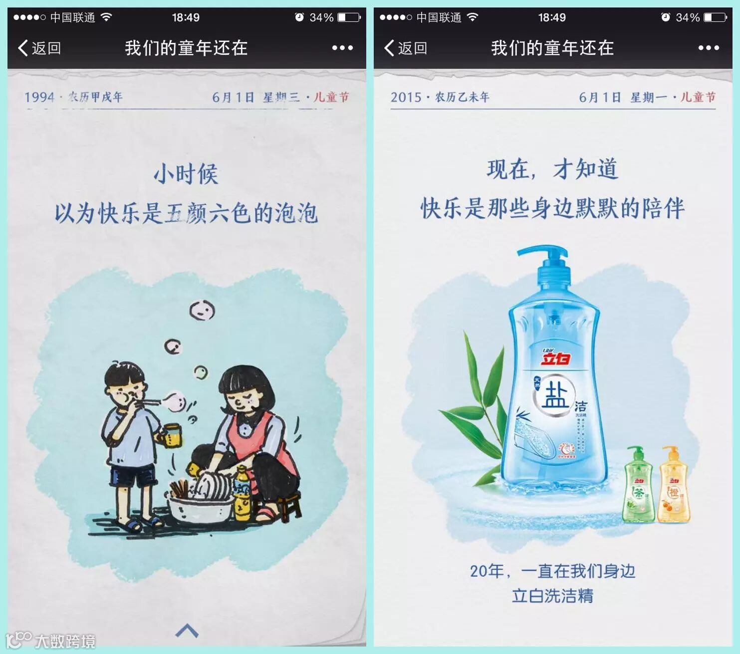 而今天最让人惊艳的,莫过于立白洗洁精的小清新广告。一个个彩色的泡泡,让人不禁想起童年那些充满小伙伴欢声笑语的午后。本以为是哪个肥皂水厂那么霸气重金砸向朋友圈?翻下去才知道,原来是立白洗洁精。