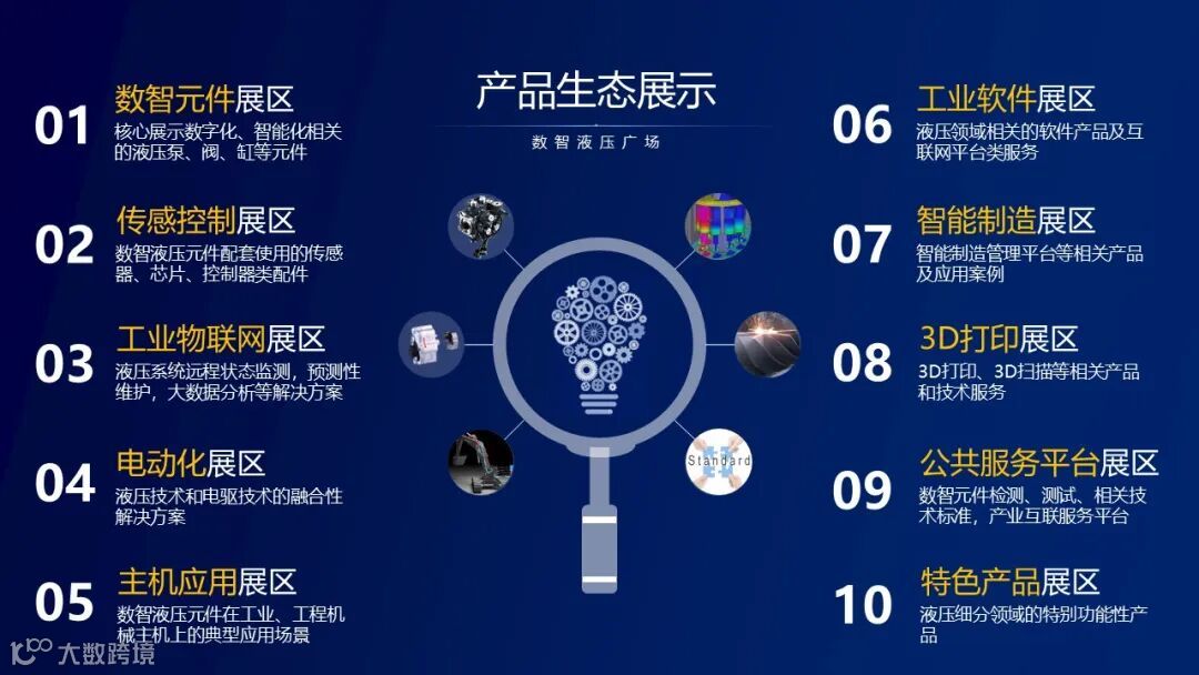 数智液压广场是以液压数智化为特色专题,以产品生态为主线的展示模式。展区以液压工业4.0的数智液压元件为主体,互联数智液压的产业链上下游,从零件到元件,从产品到应用的全生态体系展示区。
