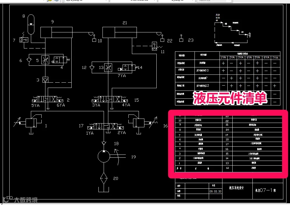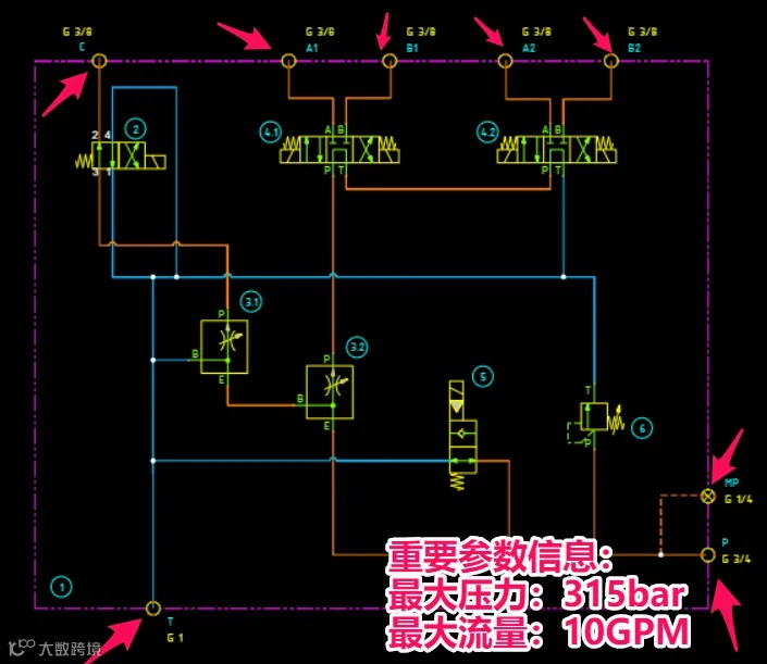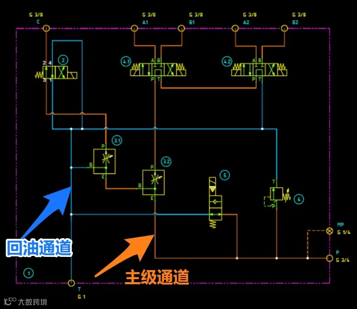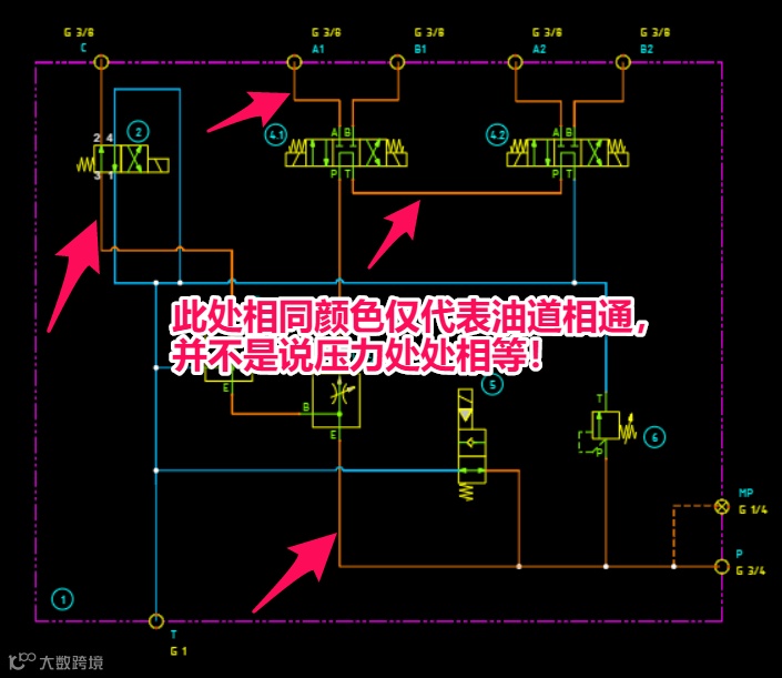 本节课,我们利用一个简单的液压原理图,然后着重讲解一下原理图上哪些信息是咱们绘制阀块关键参数。