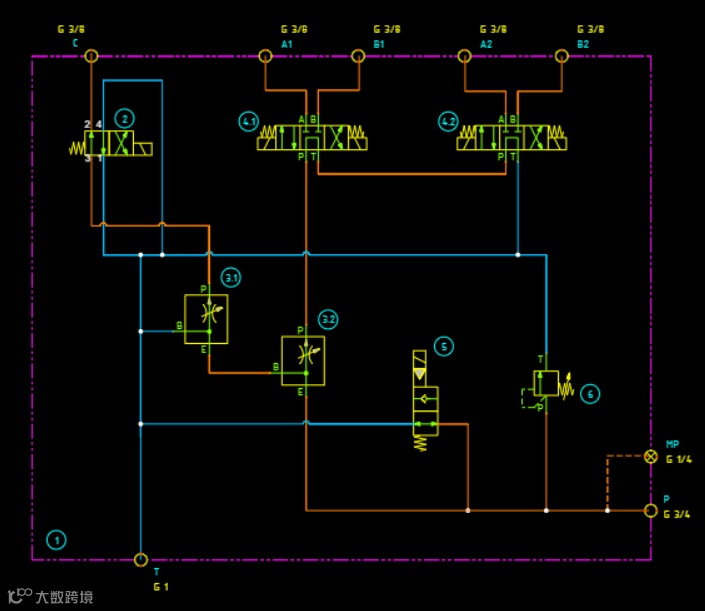 在初步完成液压原理图后,接着就是确定原理图上哪些元件需要集成到一个阀块上,最好是用一个虚线框把需要集成到一起的液压元件框选出来。接下来,我们就需要把目光聚焦在这个虚线框内了。