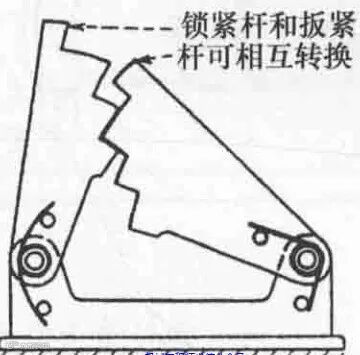 阶梯对称锁扣结构是在第二种结构基础上演变而来的,即将锁紧杆和扳紧杆的配合圆弧面做成阶梯状,没有了配合面的圆弧结构。这种机构也是有机架固定,其阶梯配合面可以实现有几个不同的锁紧位置可选择。