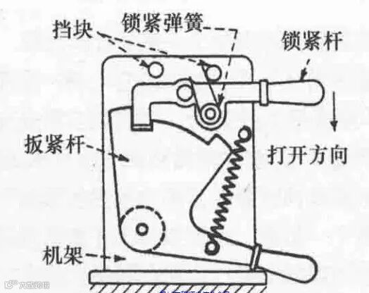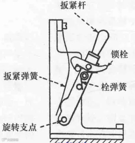 锁栓扳紧杆结构的特点是由锁栓代替了原来的锁紧杆,即锁紧杆缩短了很多,直接组装在扳紧杆上。此种机构有机架、扳紧弹簧、扭簧、扳紧杆、锁栓等组成。扳开锁栓时,扳紧杆可以靠自重下降工作。此种机构的特点是锁栓固定在扳紧杆上。