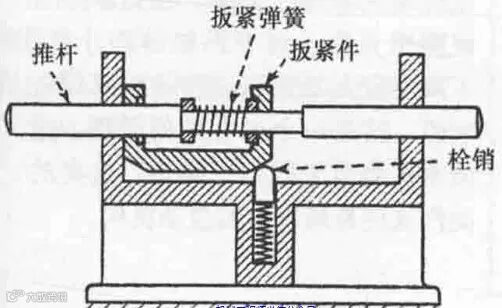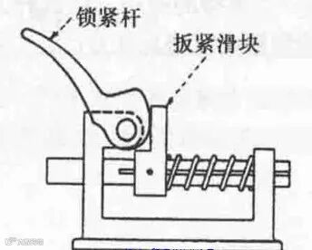 滑块锁紧结构中,扳紧杆演变成了一个滑块,通过滑块在导轨上滑动来实现锁紧与松开的动作。此机构主要有机架、扳紧滑块、锁紧杆、弹簧、导轨组成。需要注意的设计点是锁紧杆的一端必须有圆弧面,这样才能保证锁紧杆与扳紧滑块配合接触时能够顺利滑动。