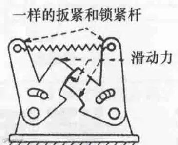 对称锁扣结构的锁紧杆和扳紧杆是一样的,形状和结构一样,其分别布局在机架两边,通过弹簧连接,需要注意的是锁紧杆和扳紧杆配合的位置需要做成圆弧,方便滑动。这种结构有一个特点是扳紧杆既可以做锁紧杆也可以做扳紧杆,锁紧杆既可以做扳紧杆也可以做锁紧杆。