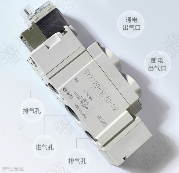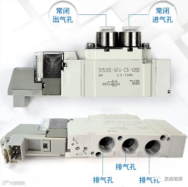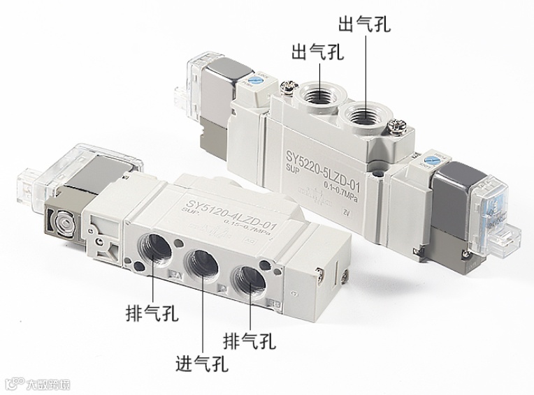 两位五通电磁阀具有1个进气孔(接进气气源)、1个正动作出气孔和1个反动作出气孔(分别提供给目标设备的一正一反动作的气源)、1个正动作排气孔和1个反动作排气孔(安装消声器)。