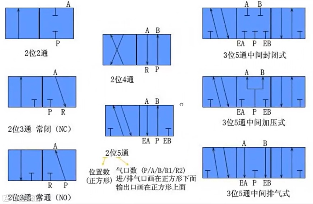 不同的“通”和“位”构成了不同类型的气动换向电磁阀。