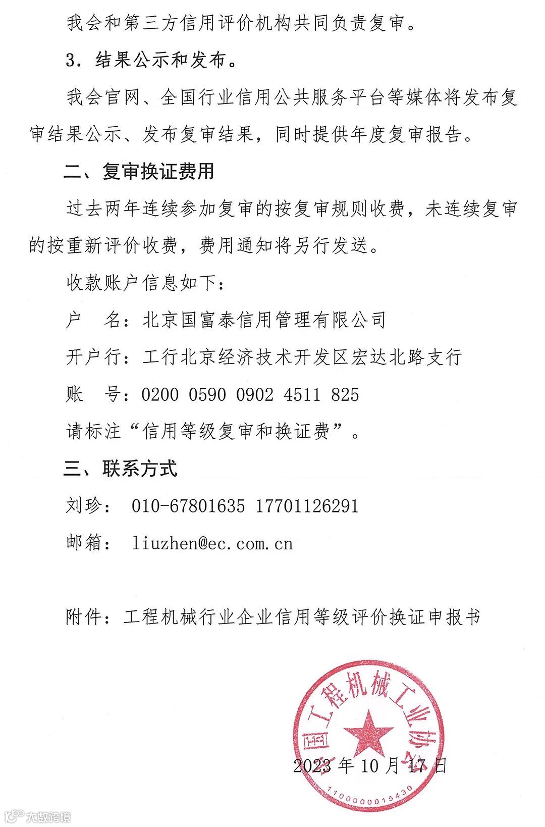 关于工程机械行业企业信用等级评价复审和到期换证的通知