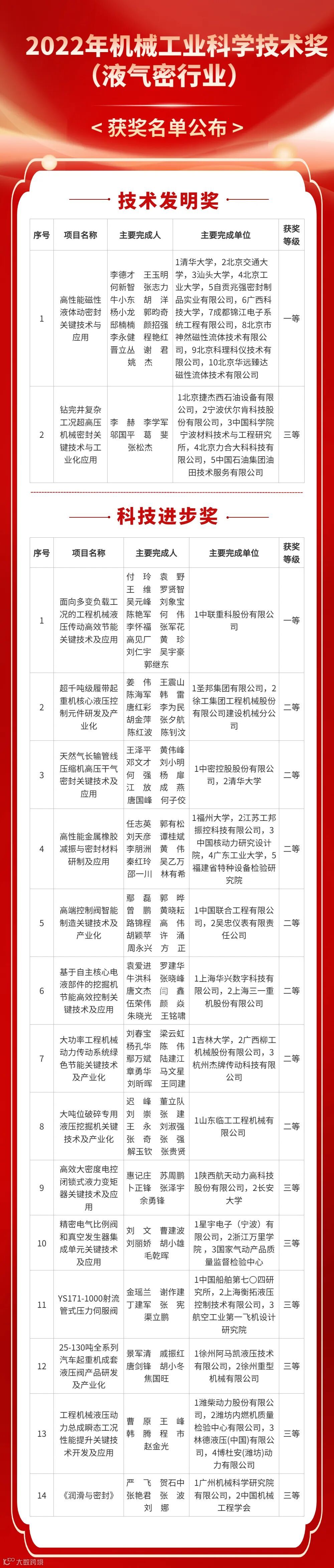 液气密行业获技术发明奖2项、科技进步奖14项,获奖项目详见下表。