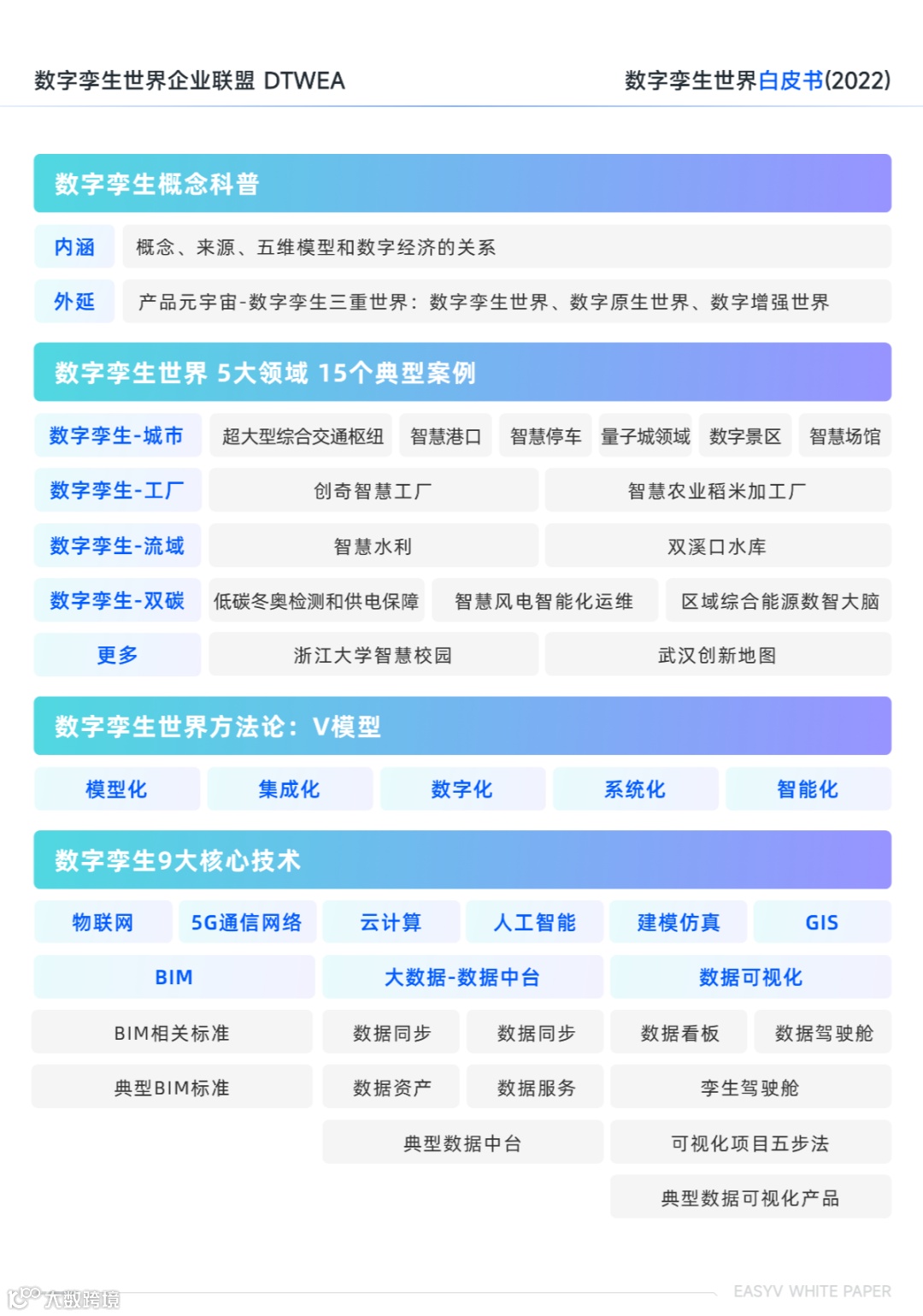 内容包括但不限于: 1、数字孪生概念 2、数字孪生起源 3、数字孪生五维模型 4、数字孪生技术 5、产业元宇宙:数字孪生的三重世界 6、数字孪生世界:重点行业与典型案例 7、数字孪生核心技术代表企业图谱 8、数字孪生城市工程技术体系 9、数字孪生工厂 10、数字孪生流域总体框架 11、数字孪生双碳 ......