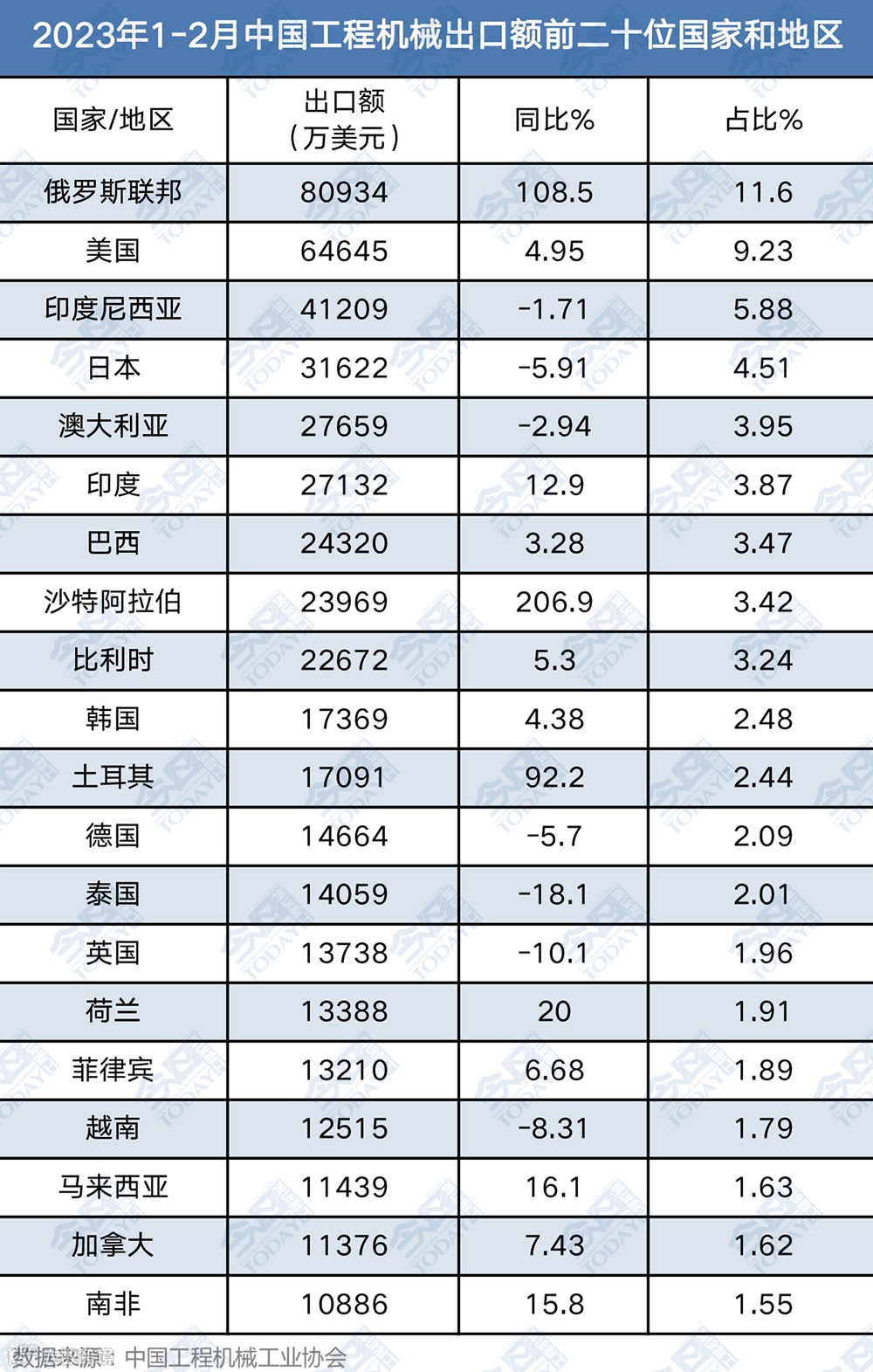2023年1-2月,向俄罗斯出口工程机械产品总额为8.09亿美元,同比增长108.5%。超越美国,成为中国工程机械单一国别最大出口市场,占比约11.6%。