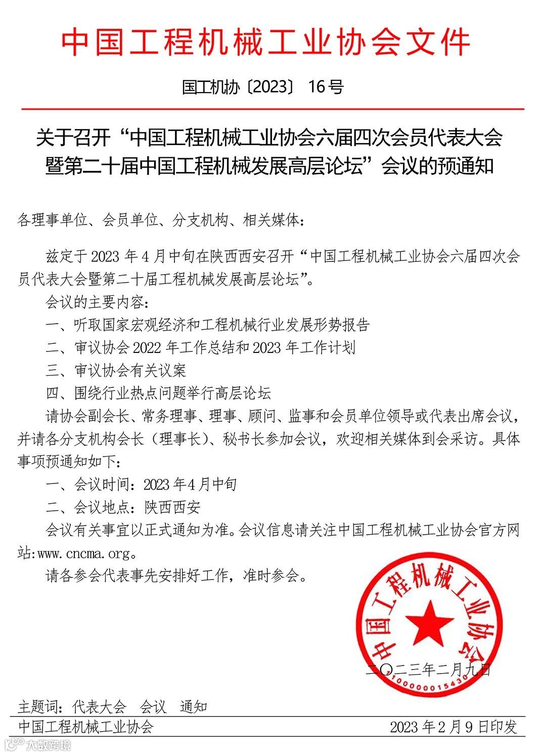 兹定于2023年4月中旬在陕西西安召开“中国工程机械工业协会六届四次会员代表大会暨第二十届工程机械发展高层论坛”。