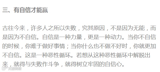 每个人的一生,难免都会遭受挫折和失败。所不同的是失败者总是把挫折当失败,从而使每次都能够深深打击他取胜的勇气;成功者则是从不言败,在一次又一次的挫折面前,总是对自己说:“我不是失败了,而是还没有成功。”一个暂时失利的人,如果继续努力,打算赢回来,那么他今天的失利,就不是真正的失败。相反的,如果他失去了再战斗的勇气,那就是真输了。