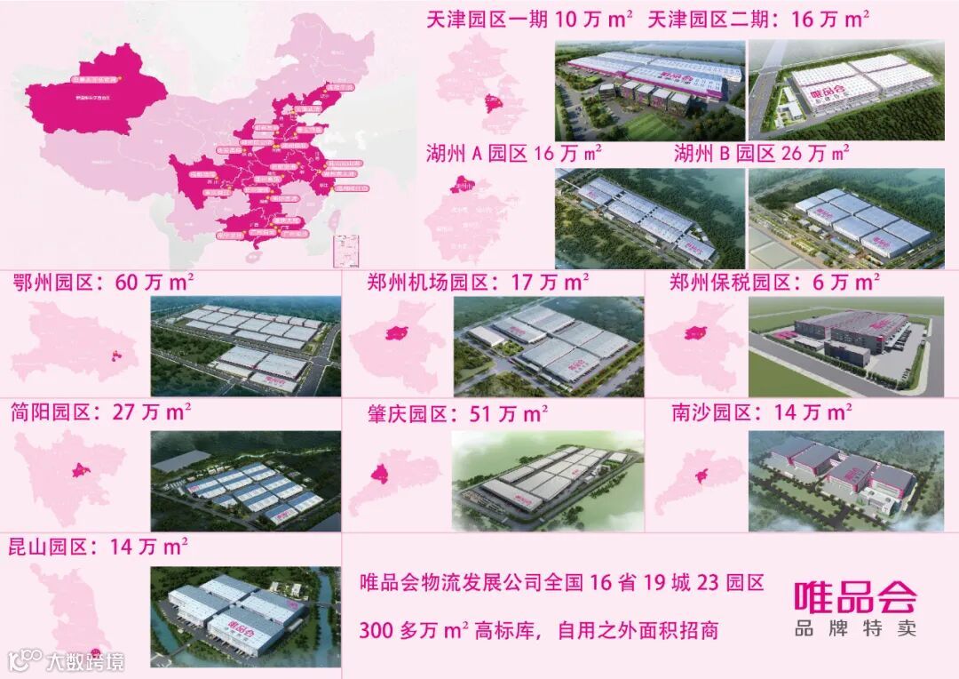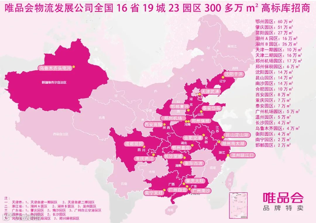 2014年1月唯品会第一个物流园区动工,经过十年建设,唯品会物流发展公司已在16个省份、19个城市建成23个物流园区,300多万平方高标库,覆盖华北到华南,华东到西南,远至新疆,完成了一纵一横加两端的全国布局,既有侧重又能扩散周边省份。无论您身处何地,都能找到离您最近的园区。