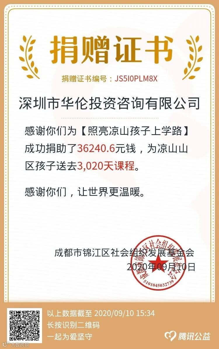 ▎阿依土豆【照亮凉山孩子上学路】为山区孩子提供一节优质课程。三天的公益活动,华伦公司为孩子们共捐助了36240.6元,为凉山山区孩子送去3020天课程。
