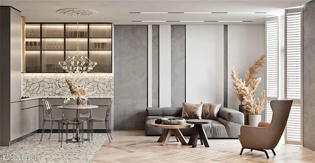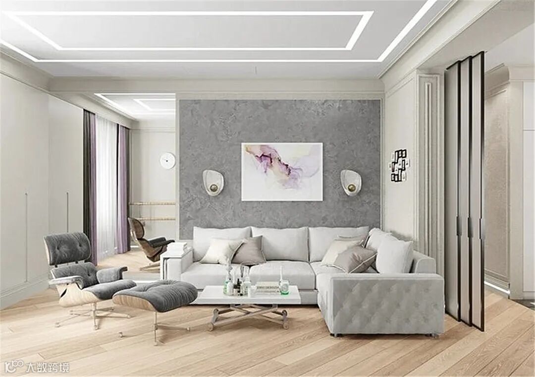 客厅背景墙是客厅装修的重头戏,它的质感、花色影响了空间的调性。暗丝绒质感的灰色就很适合客厅墙面,实用、百搭,很高级。