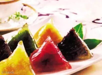 粽子:这个端午节的标志性食品,有着悠远的历史背景。粽子,又叫“角黍”、“筒粽”。其由来已久,花样繁多。据记载,早在春秋时期,用菰叶(茭白叶)包黍米成牛角状,称“角黍”;用竹筒装米密封烤熟,称“筒粽”。一直到今天,每年五月初,中国百姓家家都要浸糯米、洗粽叶、包粽子,其花色品种更为繁多。从馅料看,北方多包小枣的北京枣粽;南方则有豆沙、鲜肉、火腿、蛋黄等多种馅料,其中以浙江嘉兴粽子为代表。吃粽子的风俗,千百年来,在中国盛行不衰,而且流传到朝鲜、日本及东南亚诸国。