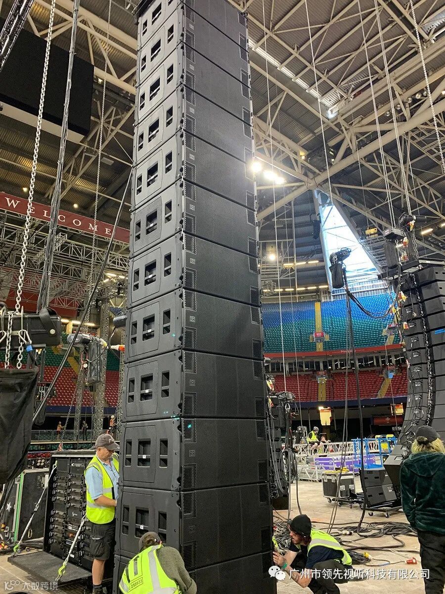对于B舞台,则选择了Wavefront Precision (WPL)线阵。这些悬挂系统由二串12 x SXHF218低音阵列组成,在每组SXHF218两侧各悬挂一串18 x WPL阵列,然后在SXHF218侧翼各吊挂一组14x WPL阵列,以及面向A主舞台再悬挂的两组WPC,以完成360°的全场覆盖,所有扬声器全部由24台 iK42多通道DSP放大器以2分频模式驱动。