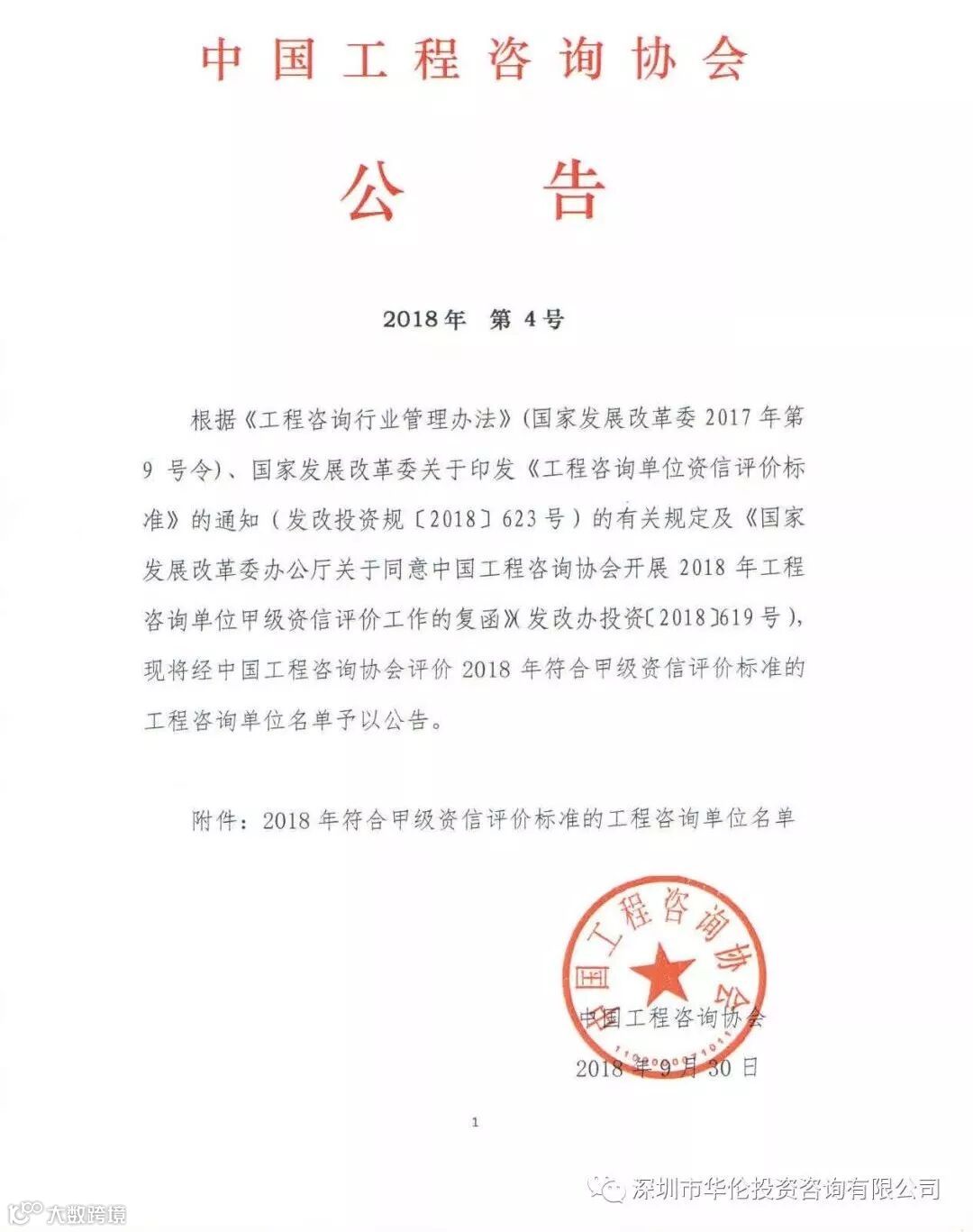 根据中国工程咨询协会公告(2018年第4号),在国家发展改革委授权组织开展的2018年工程咨询单位甲级资信评价中,我司顺利通过了专家评审及公示,已正式确认为2018年符合甲级资信评价标准的工程咨询单位,获得甲级综合资信(所有专业规划咨询和评估咨询)和12项专业资信包括:建筑;市政公用工程;生态建设和环境工程;水运(含港口河海工程);电子、信息工程(含通信、广电、信息化);机械(含智能制造);石化、化工、医药;农业、林业;水利水电;电力(含火电、水电、核电、新能源);公路;建材及专项资信PPP咨询。(详见下图)