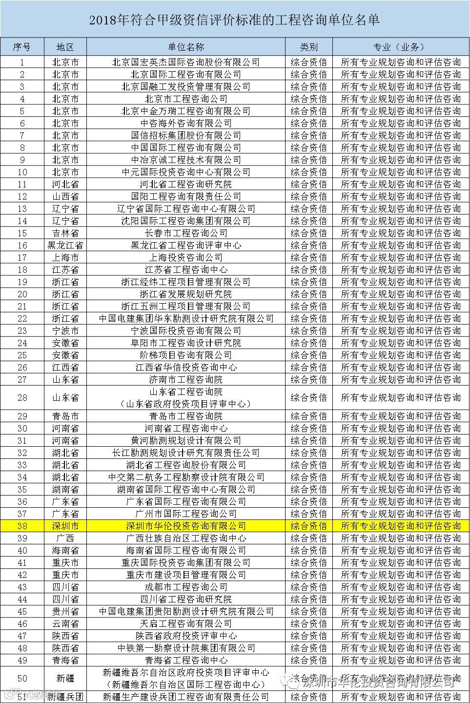 据中国工程咨询协会正式公布的2018年工程咨询单位甲级资信评价评审结果,全国共有13000余家企业申报。本次评价最终1381家企业获得甲级资信,其中只有51家企业或机构获得甲级综合资信。51家甲级综合资信企业或机构中,广东省三家,其中深圳一家(详见下图)。