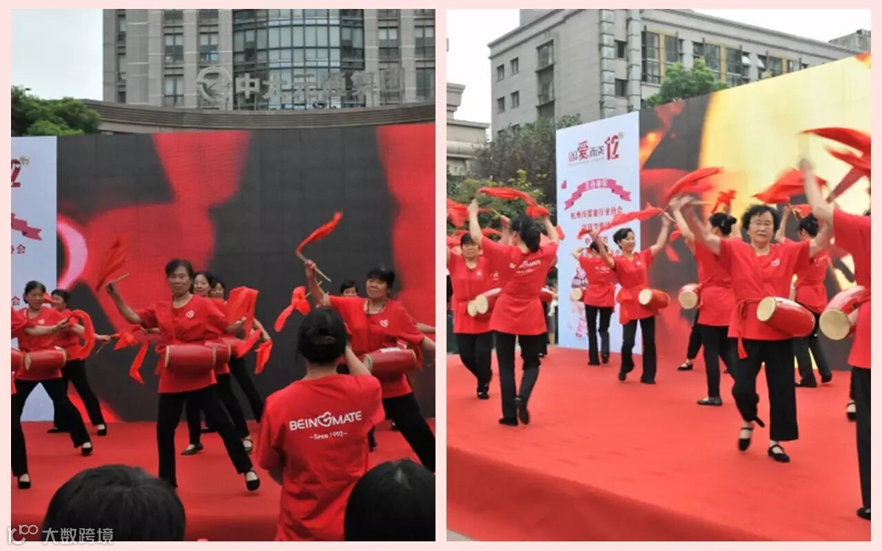 9:08分首先表演的是由天水街道带来的时尚腰鼓,阿姨们别看年纪大,舞动起来丝毫不逊色于年轻人。红色T恤,红色鼓穗,红色的背景,象征贝因美人的热情和火红的事业。