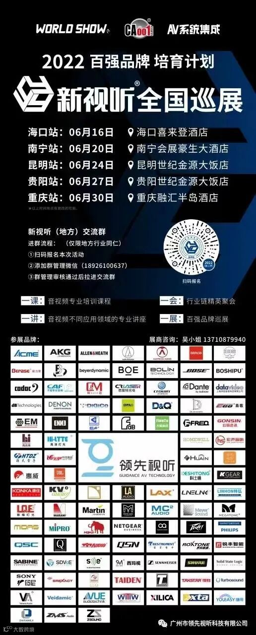 本次巡展从6月16日正式开始,直到6月30日结束,共有五个站(分别是海口站、南宁站、昆明站、贵阳站、重庆站)。巡展期间,通过优化“一课、一讲、一会、一展”模式,将2022市场中国专业音视频领域最流行的新产品、新技术、新思路带给大家!同时,100+音视频品牌纷纷亮相于此,展示高品质产品、分享最新和最前沿的技术知识与理念。