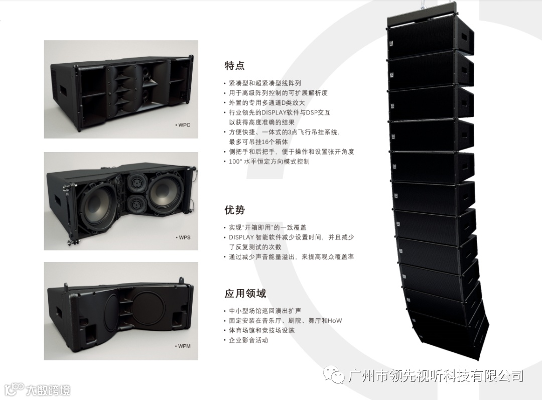 WPM是一款无源三分频,多功能、最先进的线阵列,峰值 SPL 为 130dB(峰值系数6dB),具有水平 100º(-6dB),垂直10°(-6dB)的恒定一致性覆盖角度。专为需要高输出阵列且重量和占地面积更小的中小型巡回演出和安装应用而设计。凭借出色的覆盖一致性和卓越的声音性能,WPM 的灵活性使其成为剧院、音乐厅和宗教场所现场扩声和安装的理想系统。