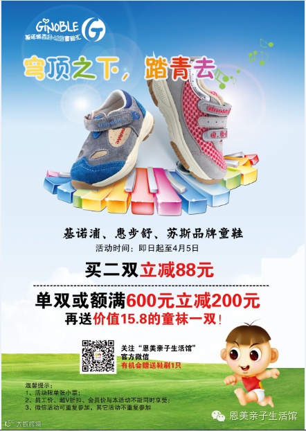 活动三:顾客参加活动一或活动二可享受现场关注恩美亲子生活馆微信公众号,有机会获得鞋刷一个