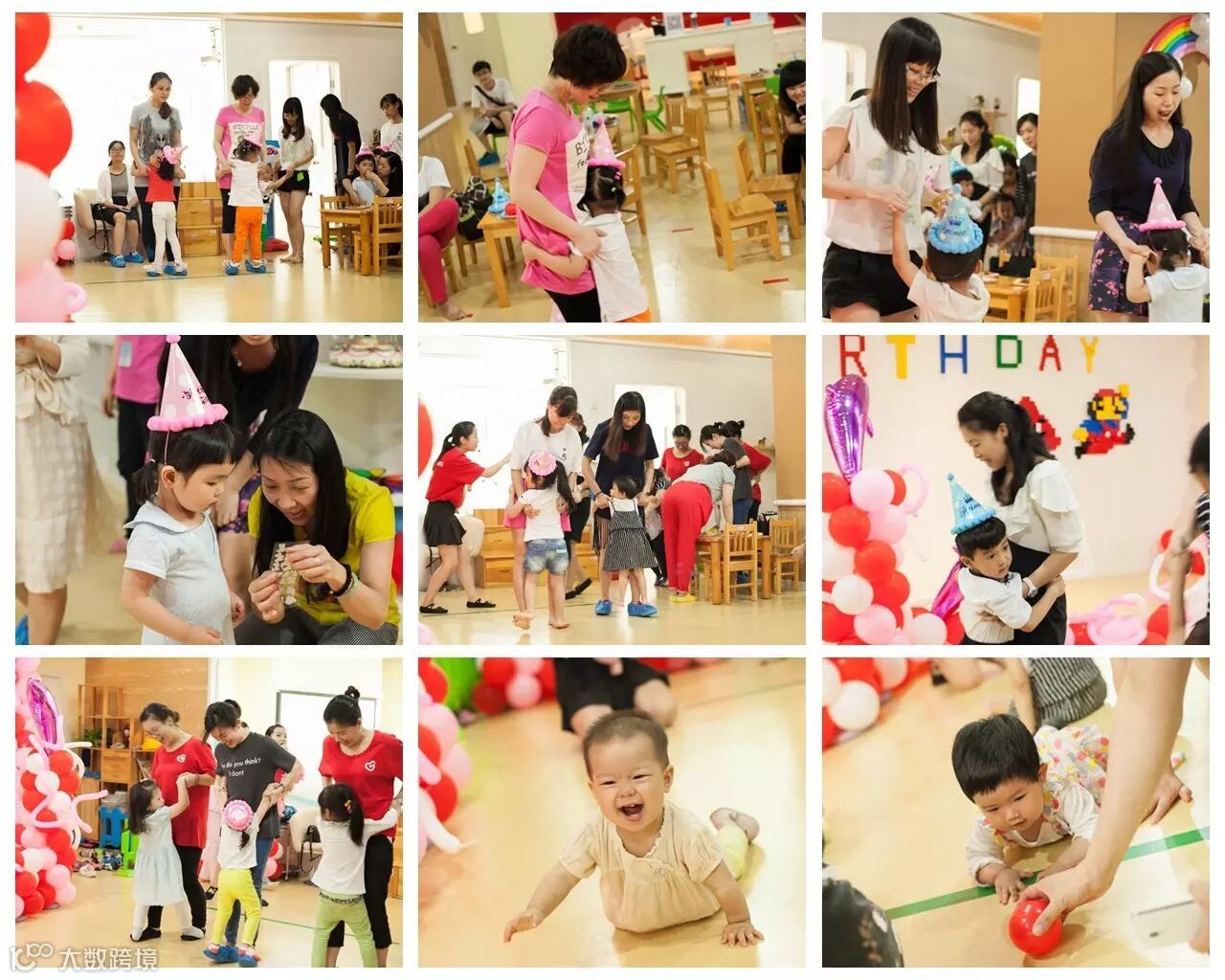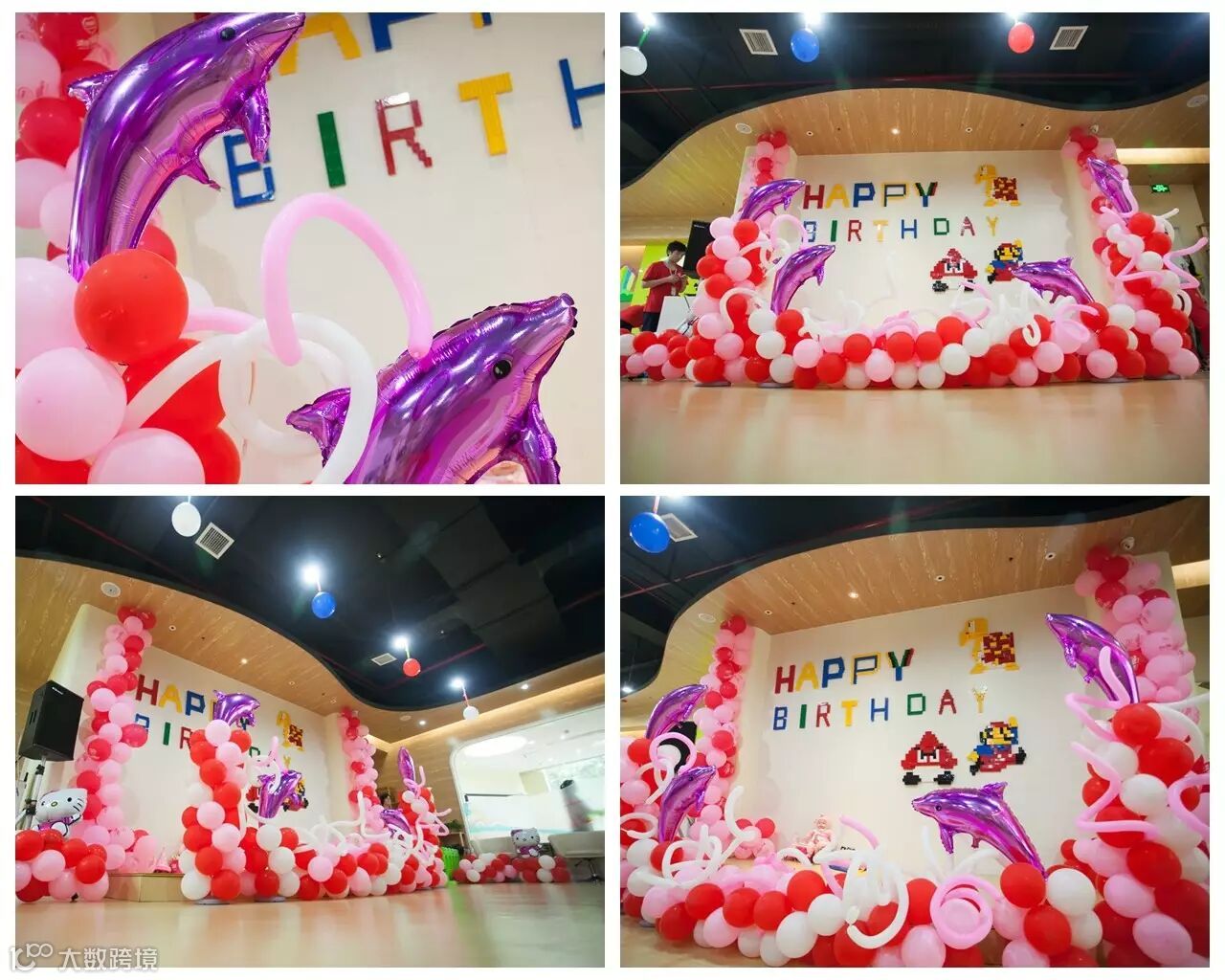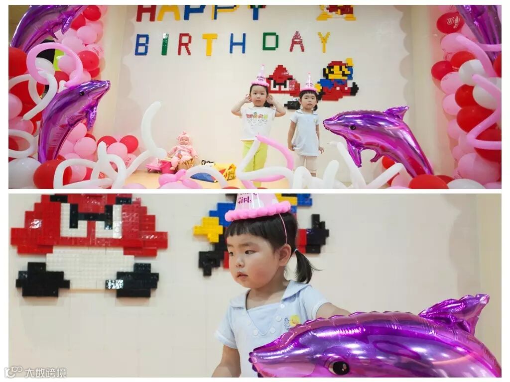 为此他们也做了不少准备哦,五彩缤纷绚丽的气球,在气球上四只腾起的海豚,在加乐高墙上搭起的创意马里奥+happy birthday,是不是也勾起了各位家长们小时候的回忆呢?O(∩_∩)O哈哈~