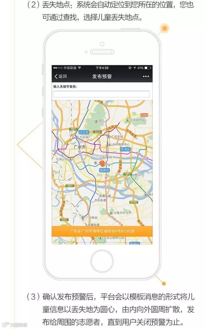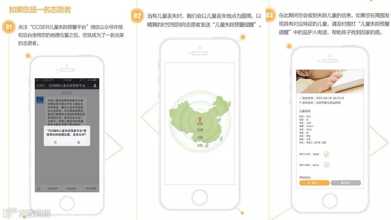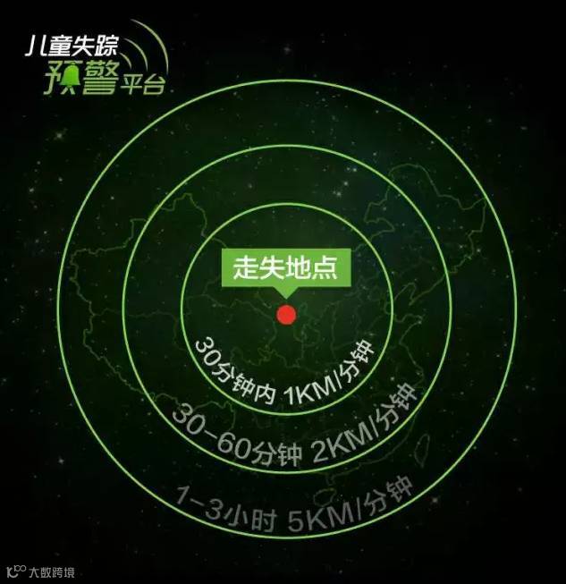 当意外发生的时候,如果家长启动了预警,周边的“志愿者”们会接收平台推送的预警信息,在儿童失踪3小时黄金时间内,形成半径30公里、90公里、690公里的三道保护失踪儿童的预警保护圈。