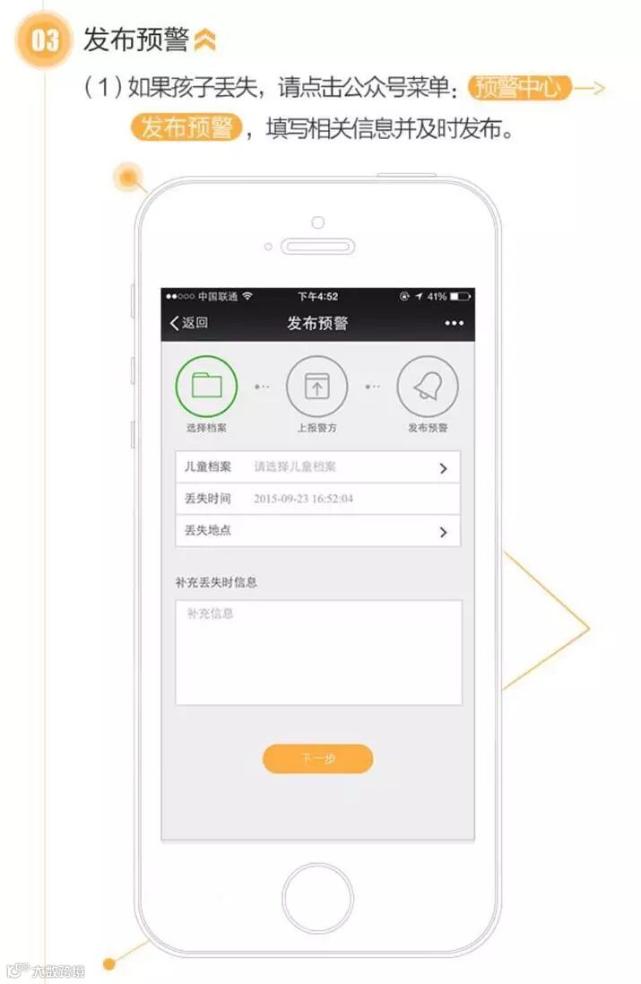 家长要做的是打开微信,在CCSER儿童失踪预警平台上,基于已经监理的儿童防丢档案,及时发布预警信息。---所以一定要提前做好档案,万一发生的时候,我相信任何一个父母都会手足无措慌乱得不知道该怎么是好!
