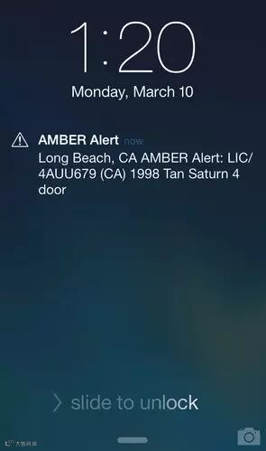 美国也不是个太平国家,一旦有孩子走丢、被绑架等事情发生,安珀警报一启动,所在区域的人们手机会开始滴滴地叫,然后收到一条长这样的推送: